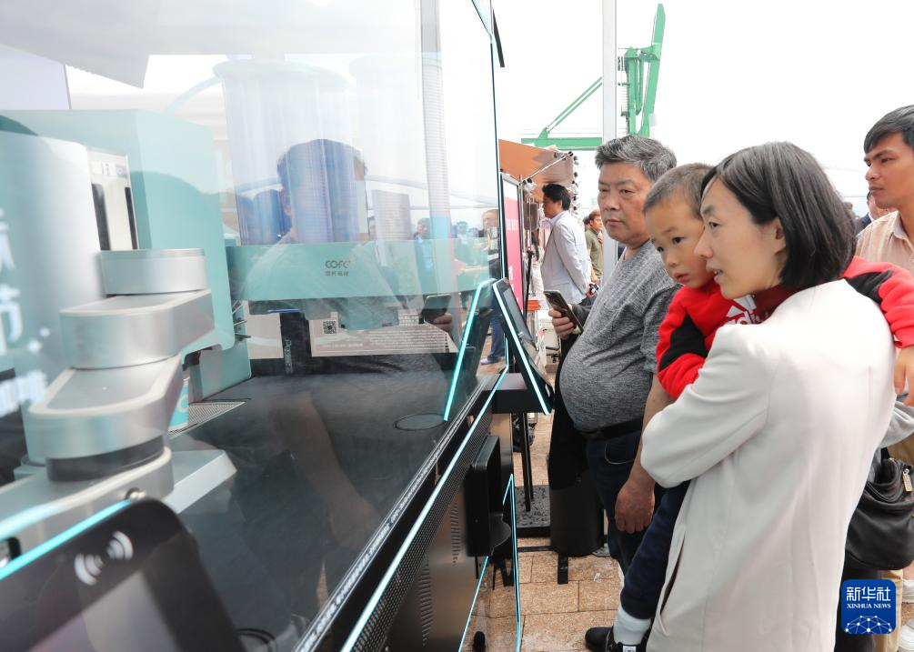 5月1日,市民和游客在一个机器人咖啡制作展位前驻足观看。