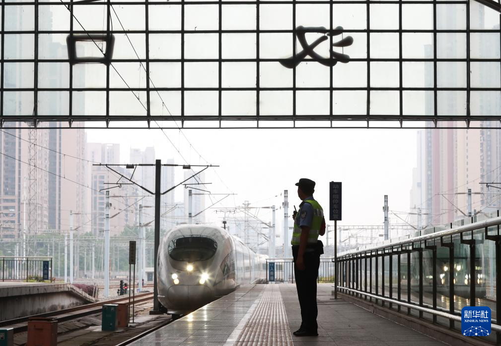 5月1日,在湖北武汉汉口火车站,武汉铁路公安处汉口车站派出所民警高宏新坚守在车站站台岗位,确保旅客列车安全。