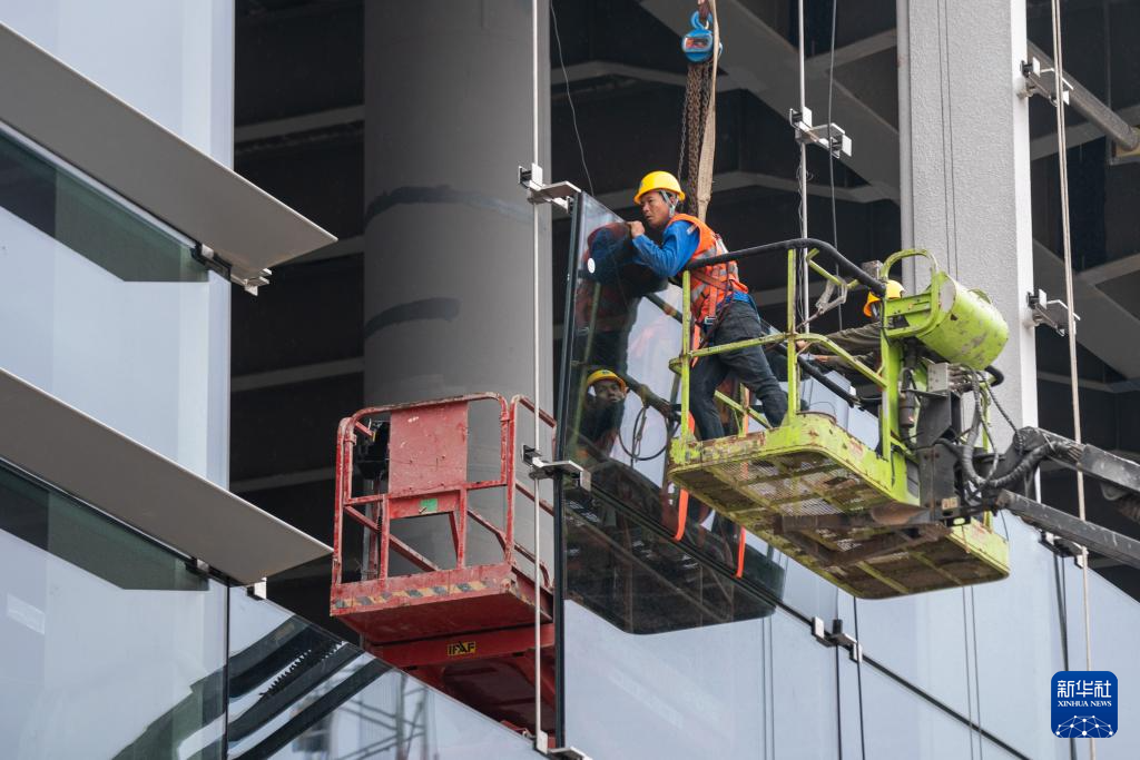 5月1日,工人在中建三局承建的福耀科技大学(暂名)图书馆外立面幕墙施工作业(无人机照片)。