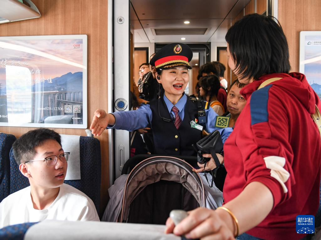 5月1日,在C770次列车上,成都客运段列车长杜娟在车厢内和旅客交流。
