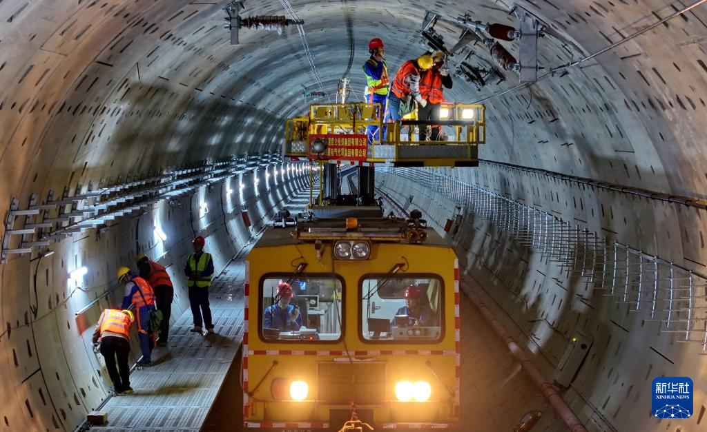 5月1日,成都轨道交通17号线二期施工现场,中国铁建供电专业工人在地下20米隧道深处开展接触网放线工作。