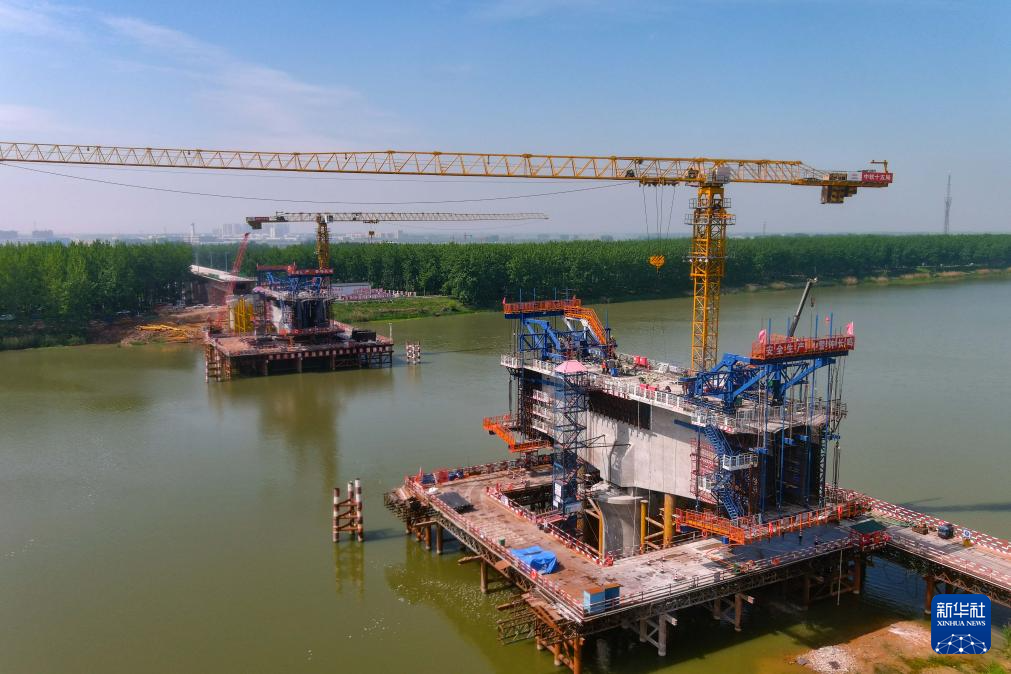 5月1日,中铁十五局施工人员在合新铁路安徽五河段怀洪新河特大桥项目建设现场作业(无人机照片)。