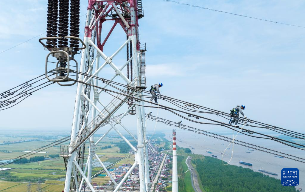 5月1日,在安徽省安庆市望江县,安徽送变电工程有限公司检修工人在200多米高空中检修±800千伏特高压锦苏线跨长江线路(无人机照片)。