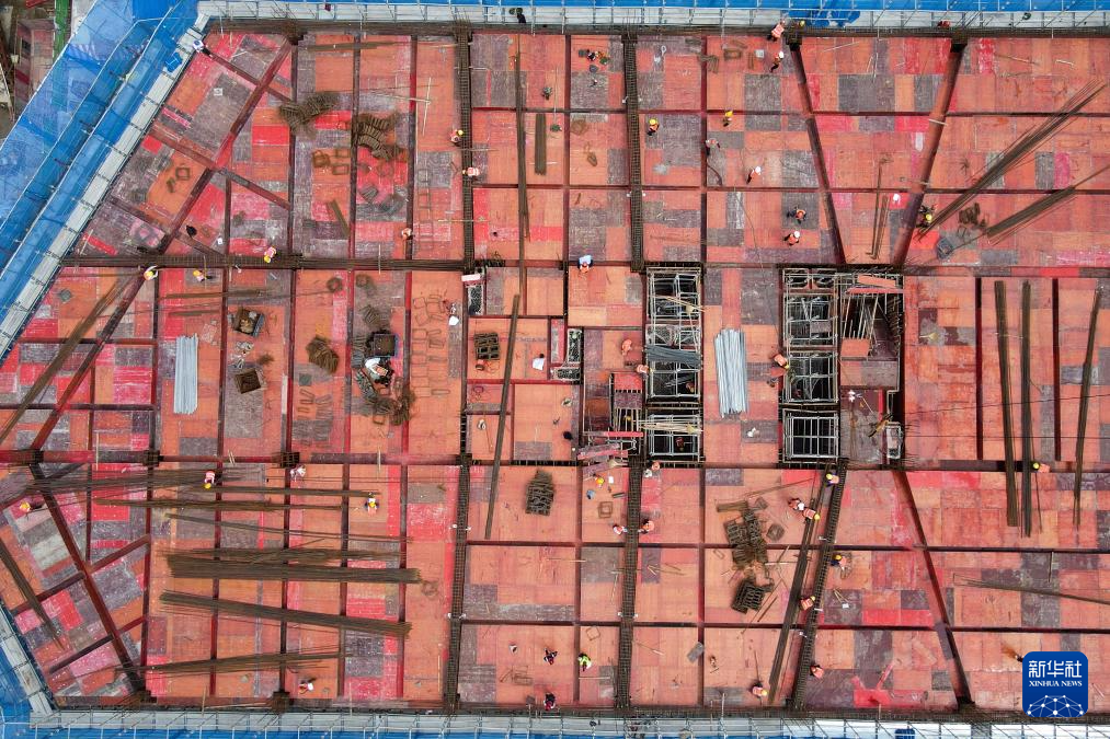 5月1日,中建八局施工人员在合肥金融广场项目建设现场作业(无人机照片)。