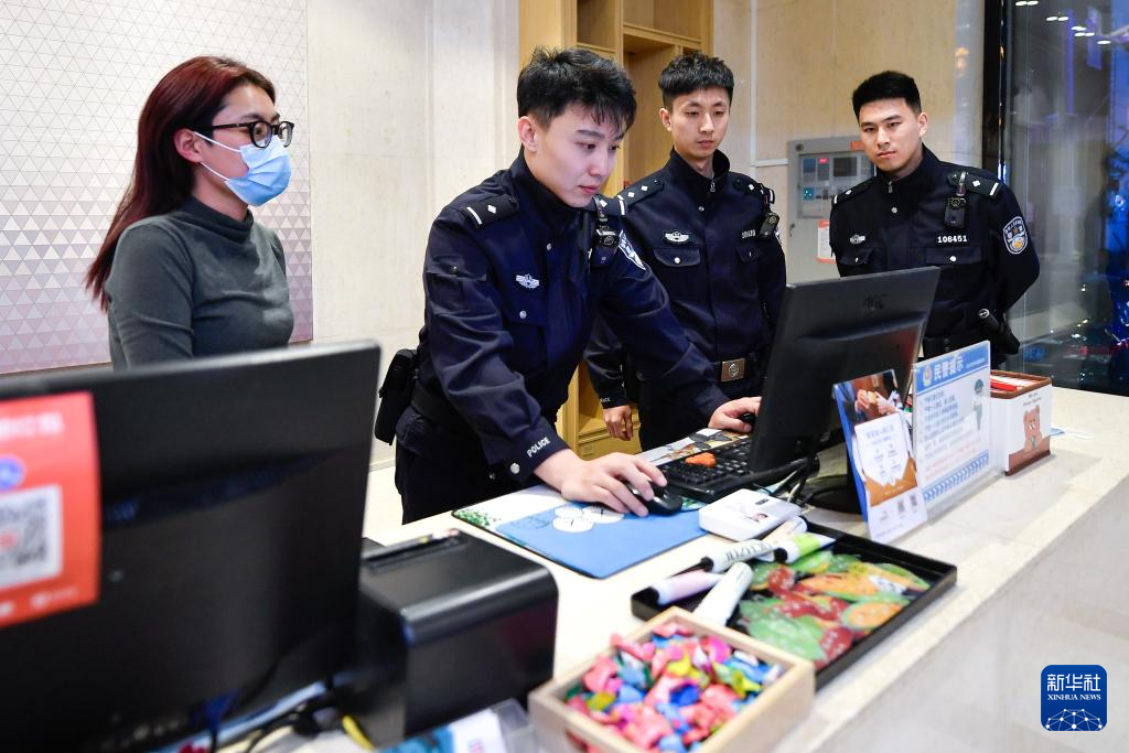长春市公安局二道区分局东盛路派出所民警曹铂巍(右二)、孟宪泽(右一)、潘越飞(右三)在辖区一家宾馆进行巡检(4月30日摄)。