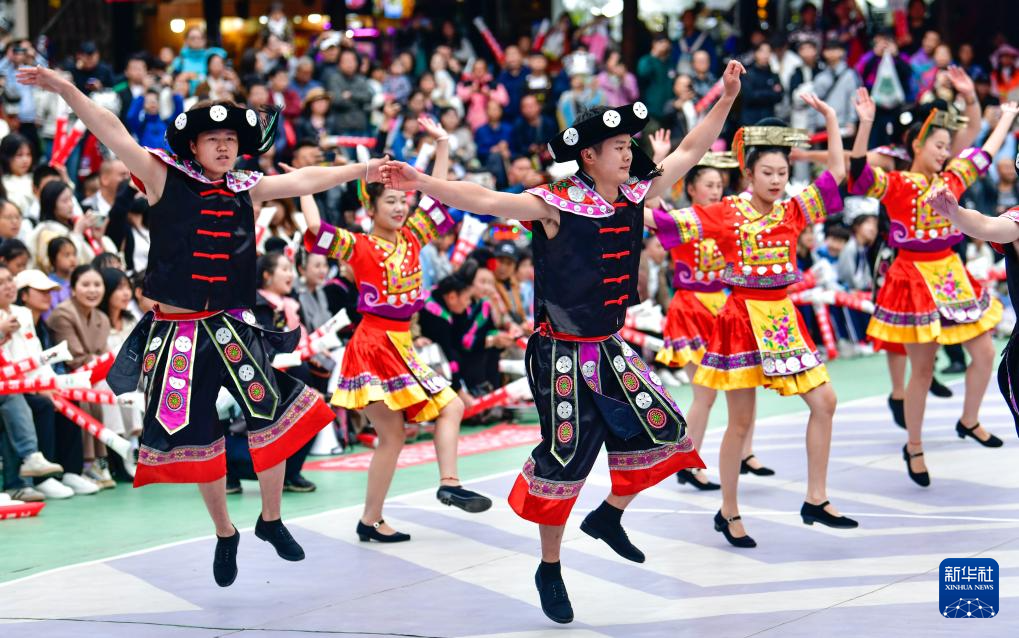 5月1日,演员在贵州省第一届“姑妈”篮球邀请赛间隙表演反排木鼓舞。