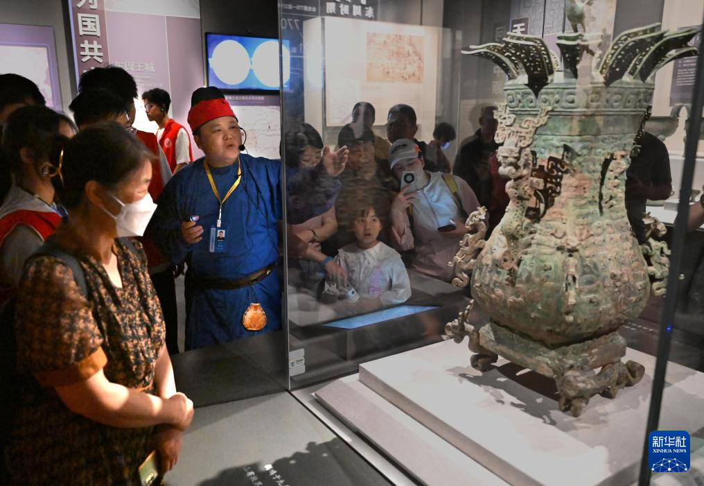 4月26日,河南博物院志愿者刘焱在馆内讲解莲鹤方壶。