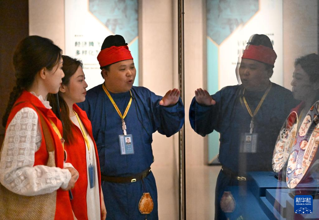 4月26日,河南博物院志愿者刘焱(右一)为高校志愿者讲解。