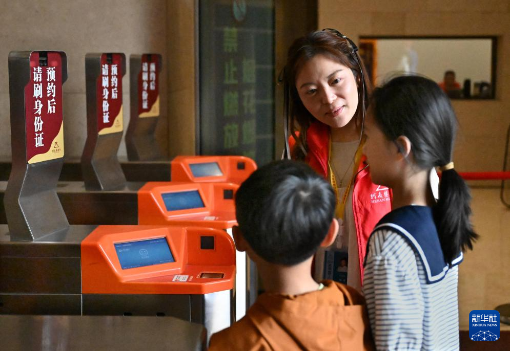 4月26日,河南博物院志愿者杨萌为小朋友提供引导服务。