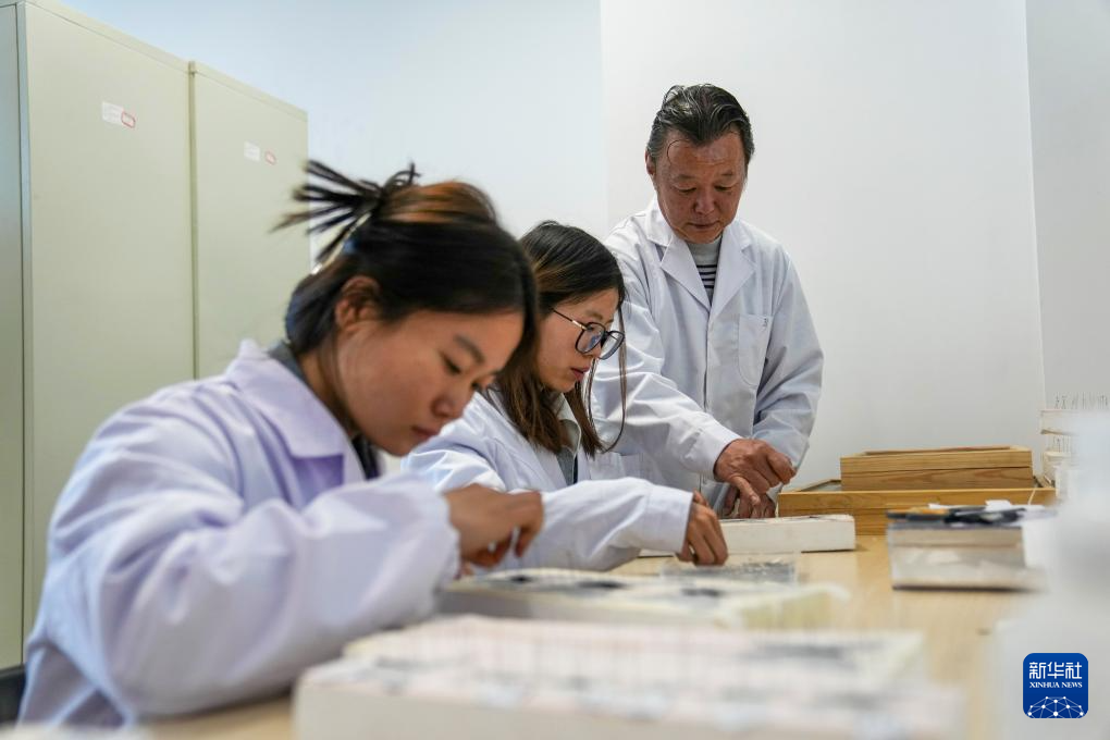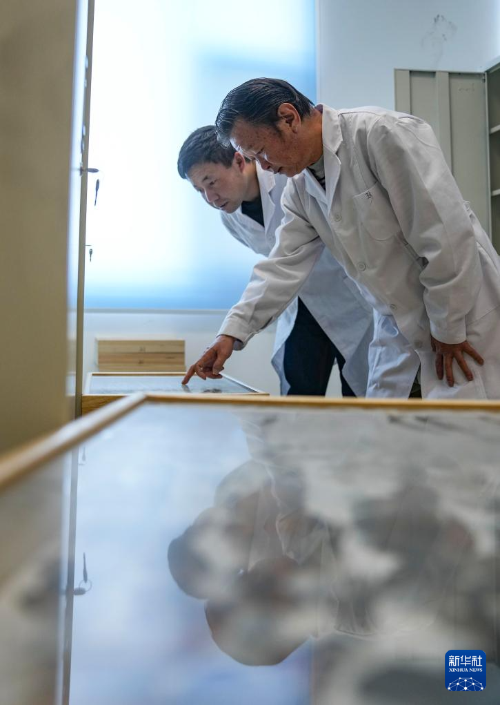在位于拉萨的西藏自治区高原生物研究所,达娃(右)和同事查看采集到的昆虫标本(4月22日摄)。