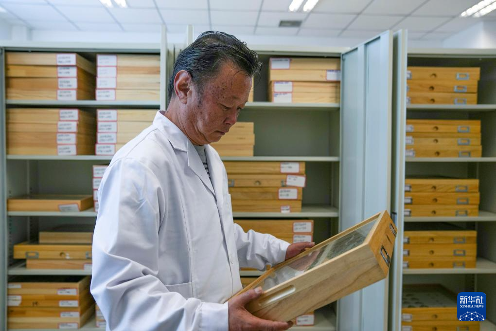达娃在位于拉萨的西藏自治区高原生物研究所检视昆虫标本(4月22日摄)。