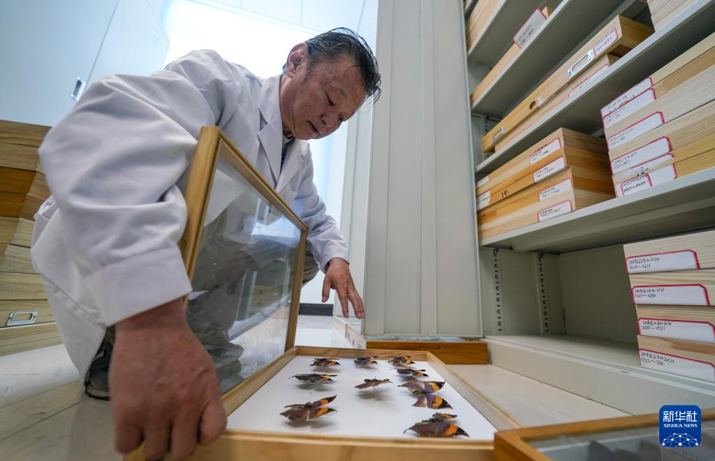 达娃在位于拉萨的西藏自治区高原生物研究所展示馆藏的蝴蝶标本(4月22日摄)。