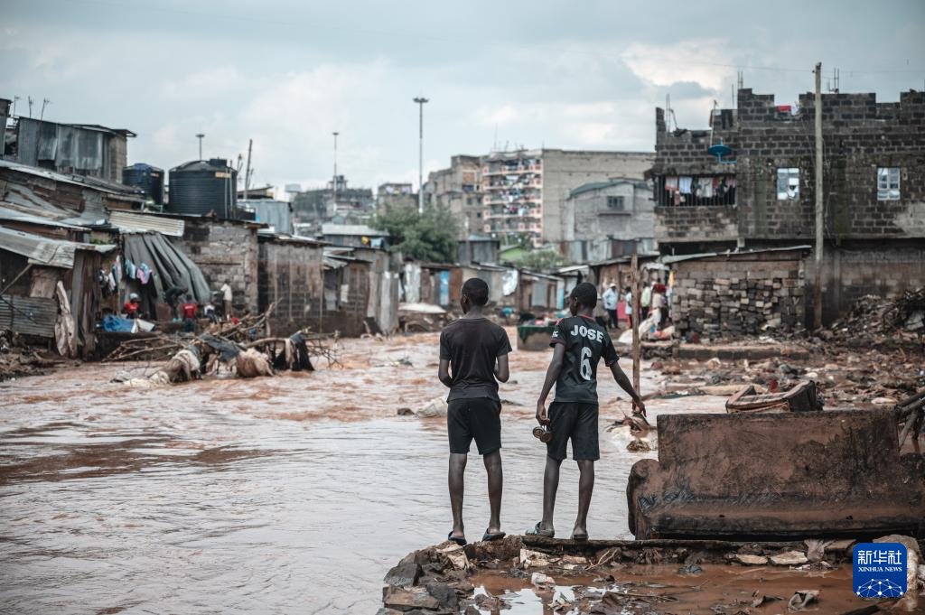 4月30日,在肯尼亚首都内罗毕的马萨雷贫民区,两名青少年站在被洪水冲毁的废墟上。