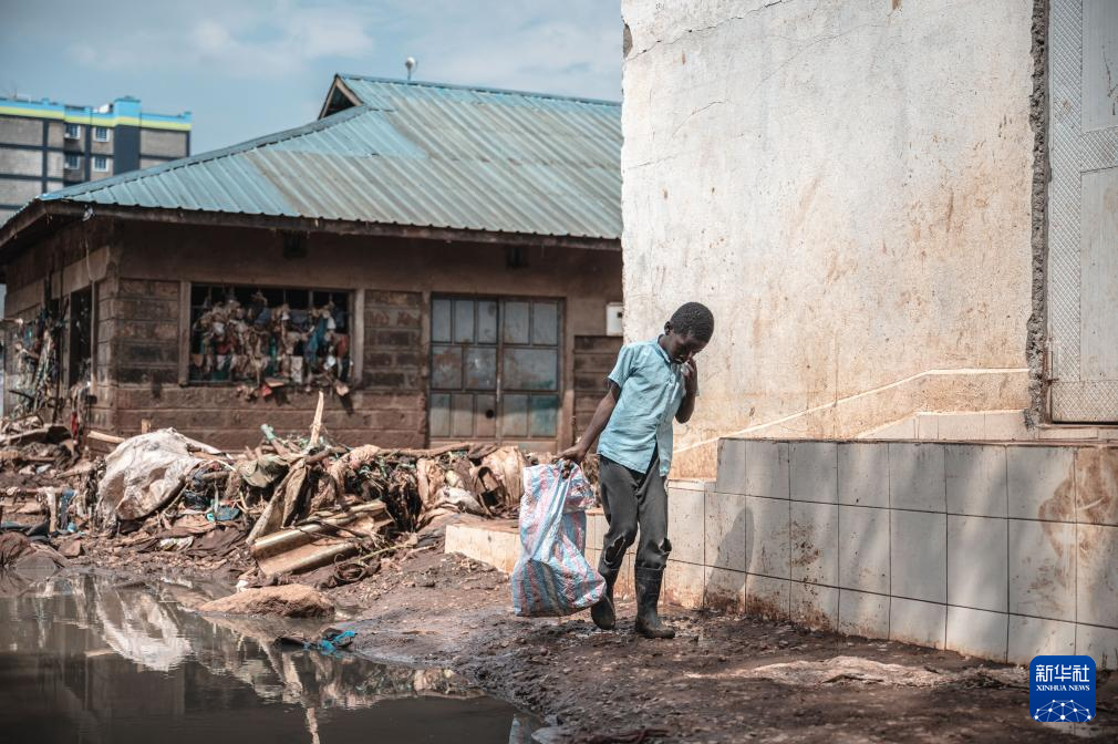 4月30日,在肯尼亚首都内罗毕的马萨雷贫民区,一名儿童捡拾被水冲走的物品。