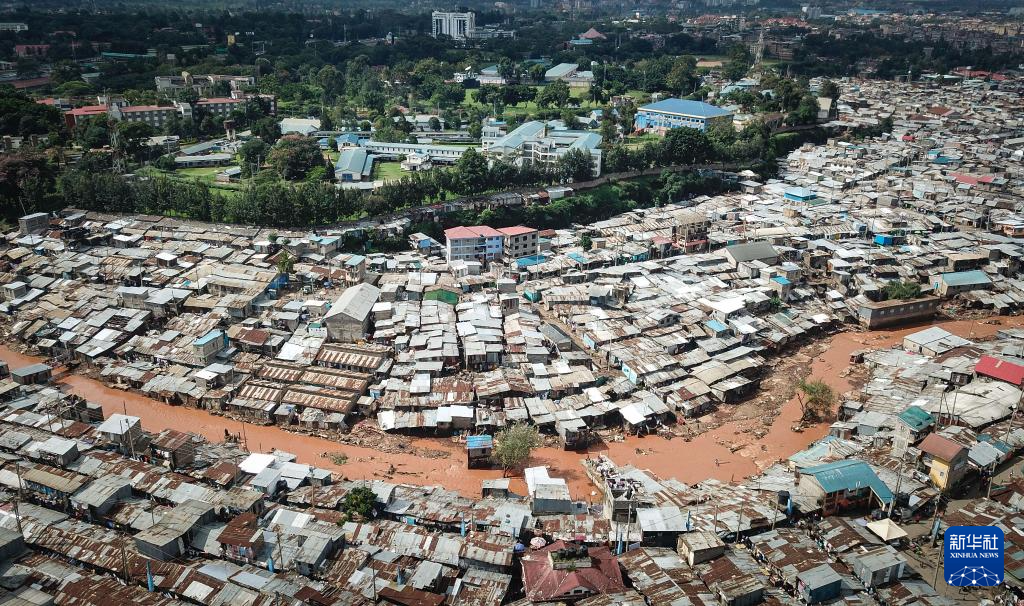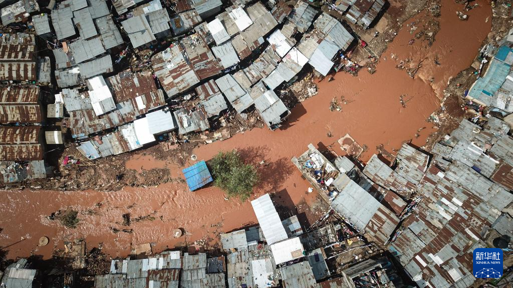 这是4月30日在肯尼亚首都内罗毕航拍的受洪水影响的马萨雷贫民区(无人机照片)。