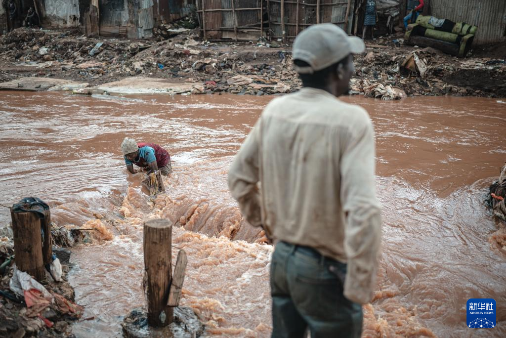 4月30日,在肯尼亚首都内罗毕的马萨雷贫民区,一名男子在马萨雷河中捡拾被水冲走的物品。