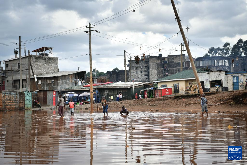 4月30日,在肯尼亚首都内罗毕的马萨雷贫民区,孩子们在积水区域玩耍。