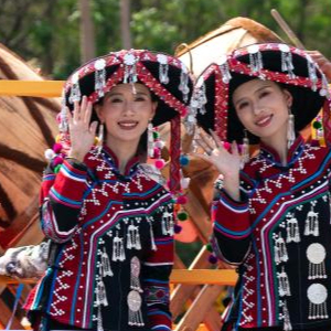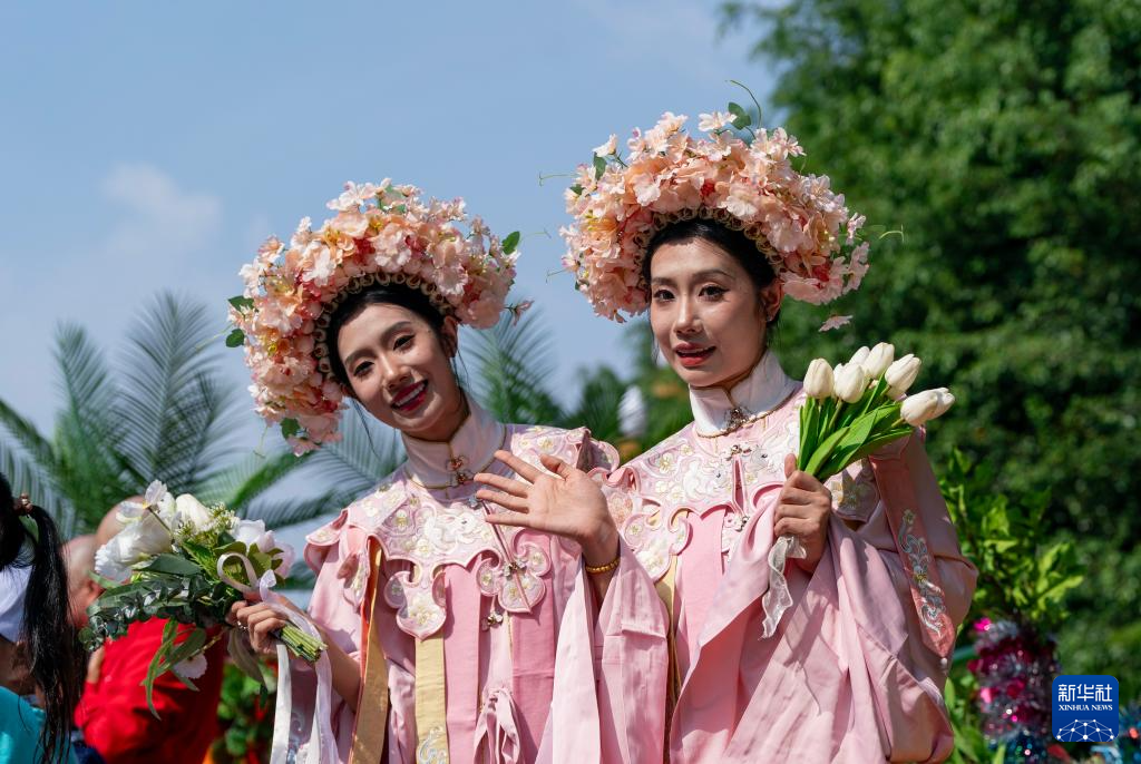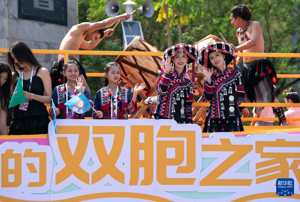 5月2日,双胞胎们在云南墨江参加双胞胎风情巡游活动时向观众挥手致意。
