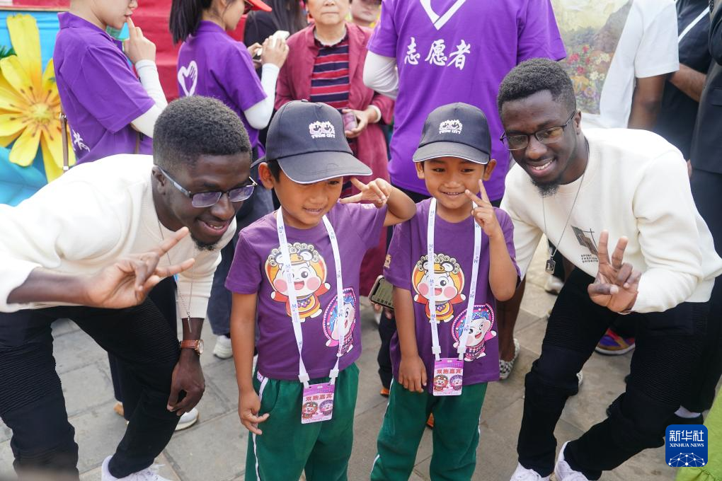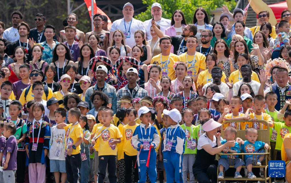 5月2日,一对来自中国的双胞胎和一对来自海外的双胞胎在云南墨江双胞胎风情巡游活动上合影。
