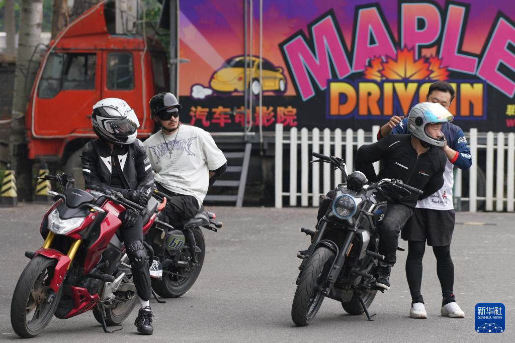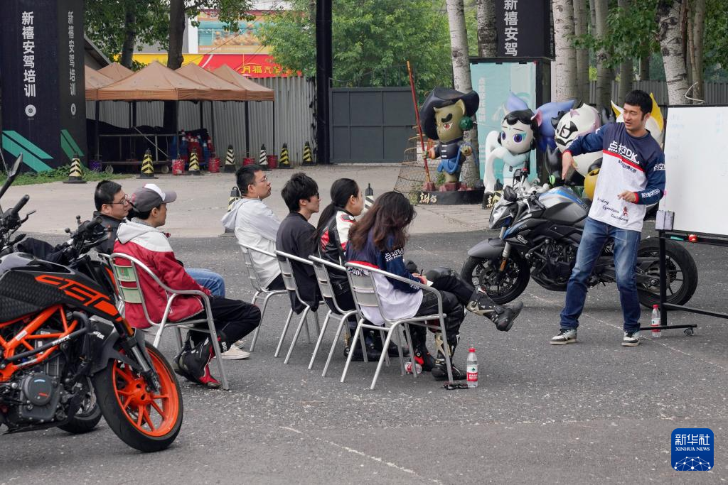 5月4日,摩托爱好者在接受理论培训,研究稍后要用到的技术。
