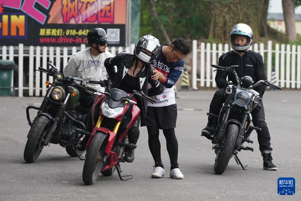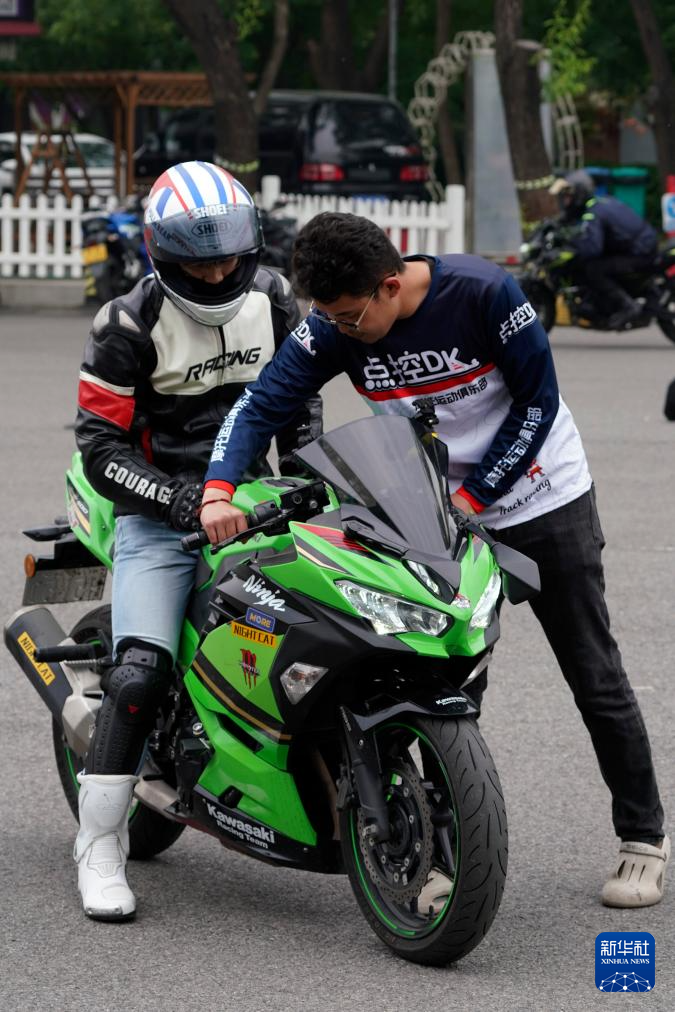 5月4日,教练为摩托爱好者纠正技术动作。
