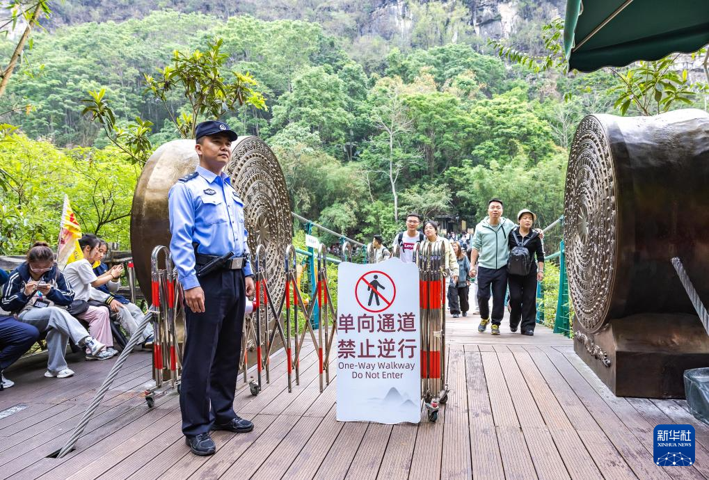 5月1日,民警在贵州省安顺市黄果树瀑布景区执勤。针对游客增多,当地向景区增派工作人员,尽全力保证景区通行效率。