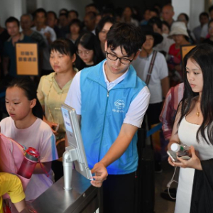 5月5日,旅客在海口市新海港出发大厅前往登船口。