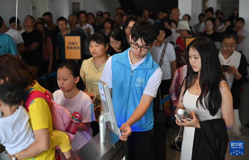 5月5日,海口市新海港的工作人员在解答旅客问询。