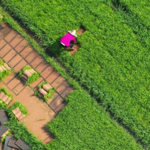 5月5日,在四川省内江市东兴区长江现代农业园区,农民在集中育秧基地起秧苗(无人机照片)。
