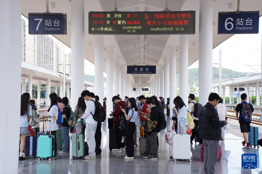 5月5日,旅客在福建龙岩火车站排队准备乘车。