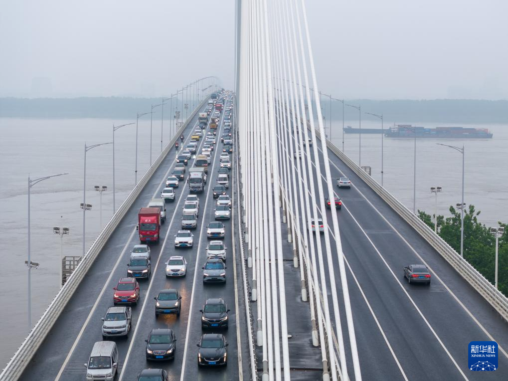 5月5日拍摄的南京江心洲长江大桥上的车流(无人机照片)。