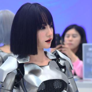 仿生人形机器人在2024中关村论坛年会会场设置的咨询台“迎宾”(2024年4月27日摄)。