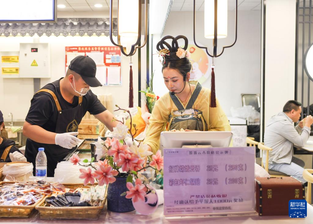 商户在新疆乌鲁木齐市水磨沟区天山明月城为游客制作美食(5月4日摄)。