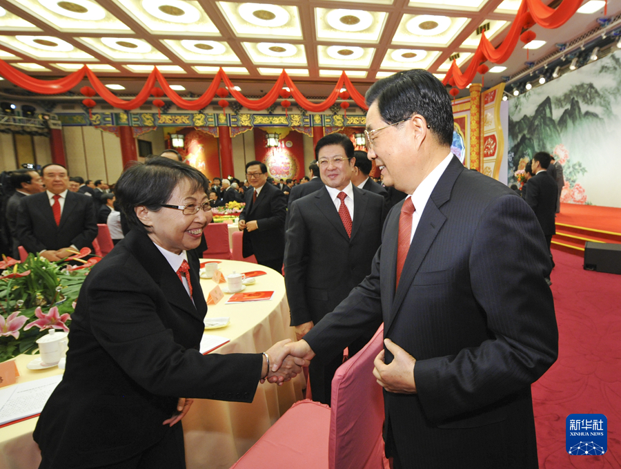 2010年1月1日,全国政协在北京全国政协礼堂举行新年茶话会。这是胡锦涛同志与乌云其木格同志握手。