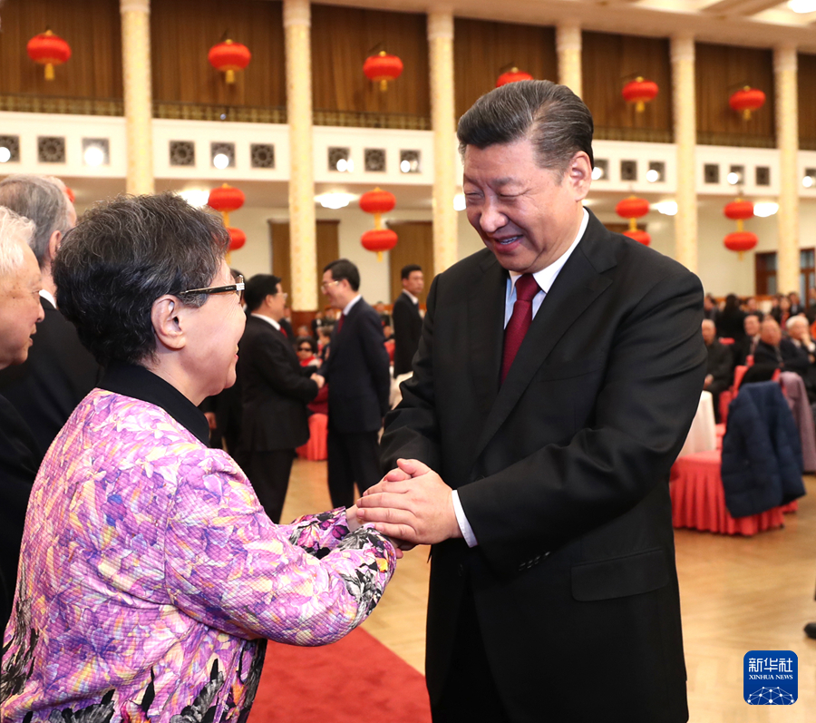 2019年2月3日,中共中央、国务院在北京人民大会堂举行春节团拜会。这是习近平同志与乌云其木格同志握手。
