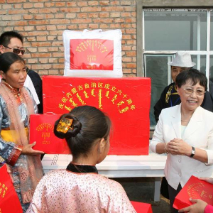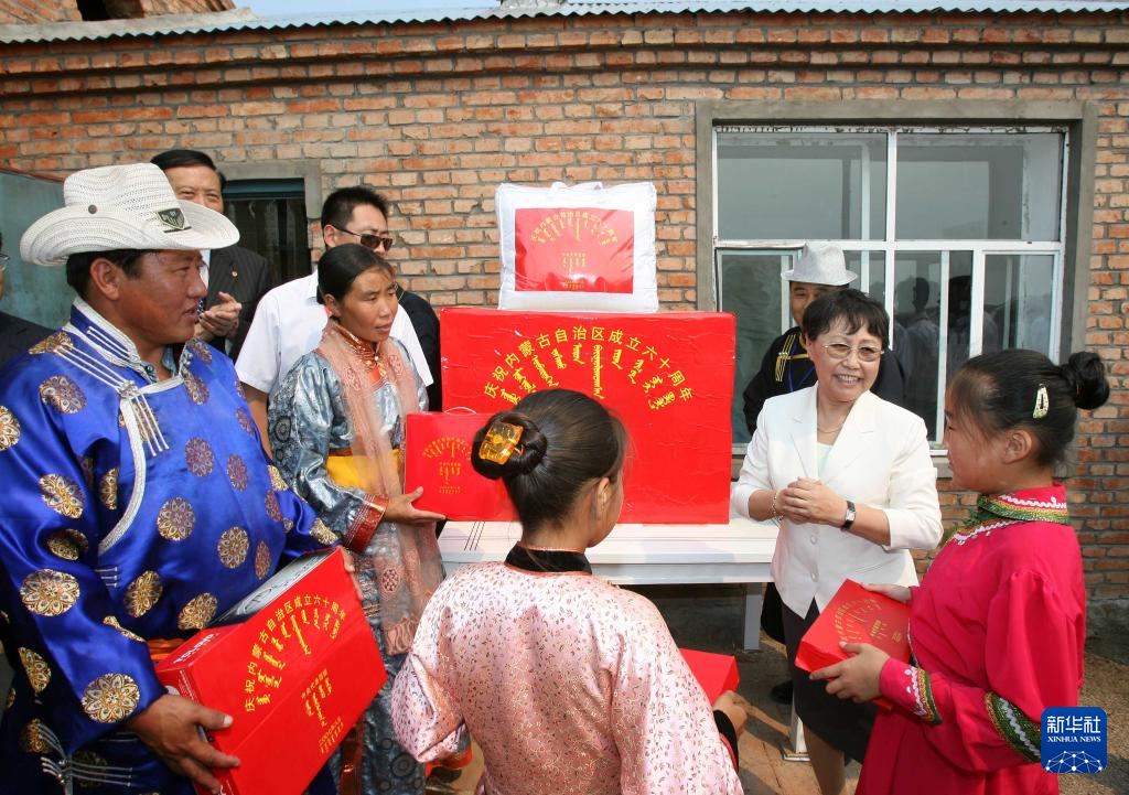 2007年8月,内蒙古自治区举行成立60周年庆典。这是8月12日,乌云其木格同志率领中央代表团三分团在赴内蒙古自治区满洲里市途中慰问牧民。