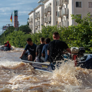 5月5日,在巴西南里奥格兰德州圣莱奥波尔多,救援人员帮助当地居民转移。