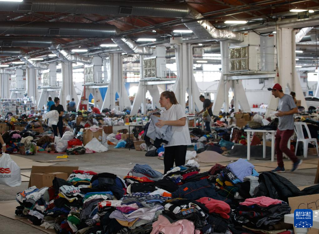 5月6日,在巴西南里奥格兰德州新汉堡,志愿者在避难所内为受灾民众分发救灾物资。