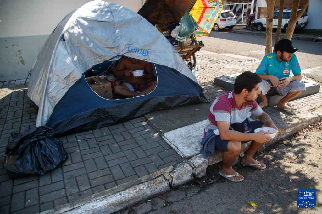 5月6日,在巴西南里奥格兰德州新汉堡,受灾民众在街边搭建的帐篷内休息。