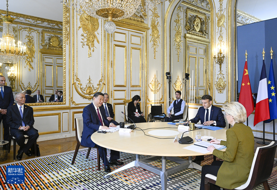 当地时间5月6日上午,国家主席习近平应邀在巴黎爱丽舍宫同法国总统马克龙、欧盟委员会主席冯德莱恩举行中法欧领导人三方会晤。