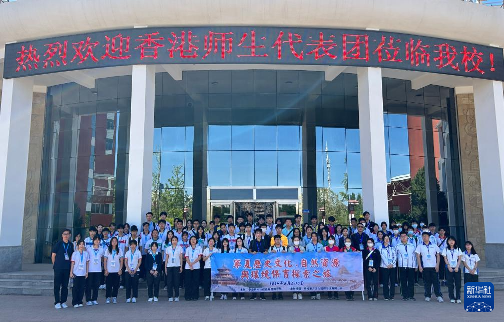 5月7日,参加“宁夏历史文化、自然资源与环境保育探索之旅”交流活动的香港师生在宁夏银川市第六中学合影留念。