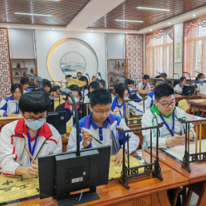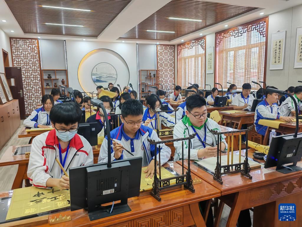5月7日,参加“宁夏历史文化、自然资源与环境保育探索之旅”交流活动的香港中学生在宁夏银川市第六中学学写毛笔字。