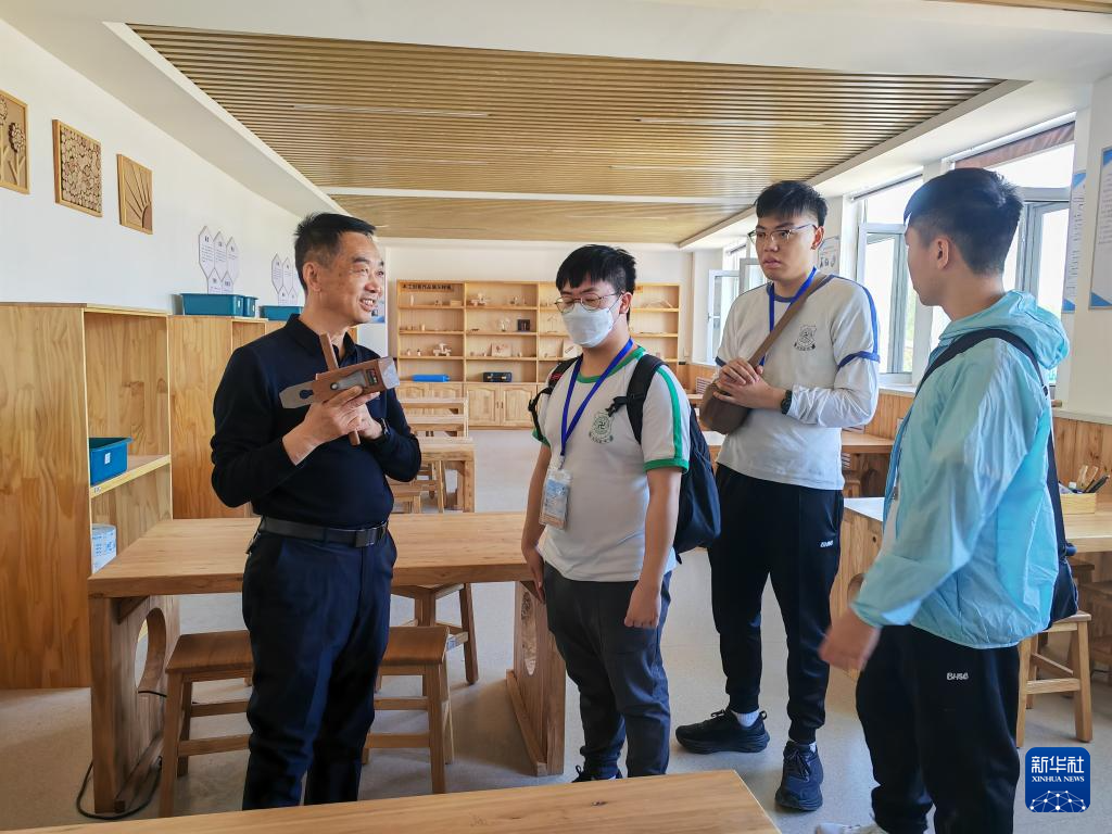 5月7日,宁夏银川市第六中学校长申晓平向参加“宁夏历史文化、自然资源与环境保育探索之旅”交流活动的香港师生介绍学生学做木工的工具。