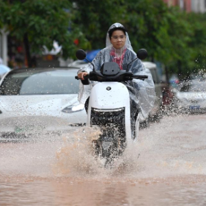 5月8日,环卫工人在广西南宁市街头清理被雨水冲刷到路面上的砂石。