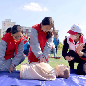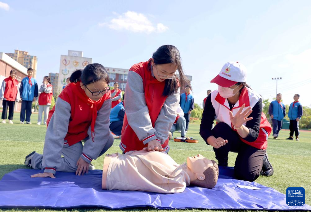 5月8日,江苏省扬州市江都区第二中学学生在红十字会工作人员的指导下学习急救技能。