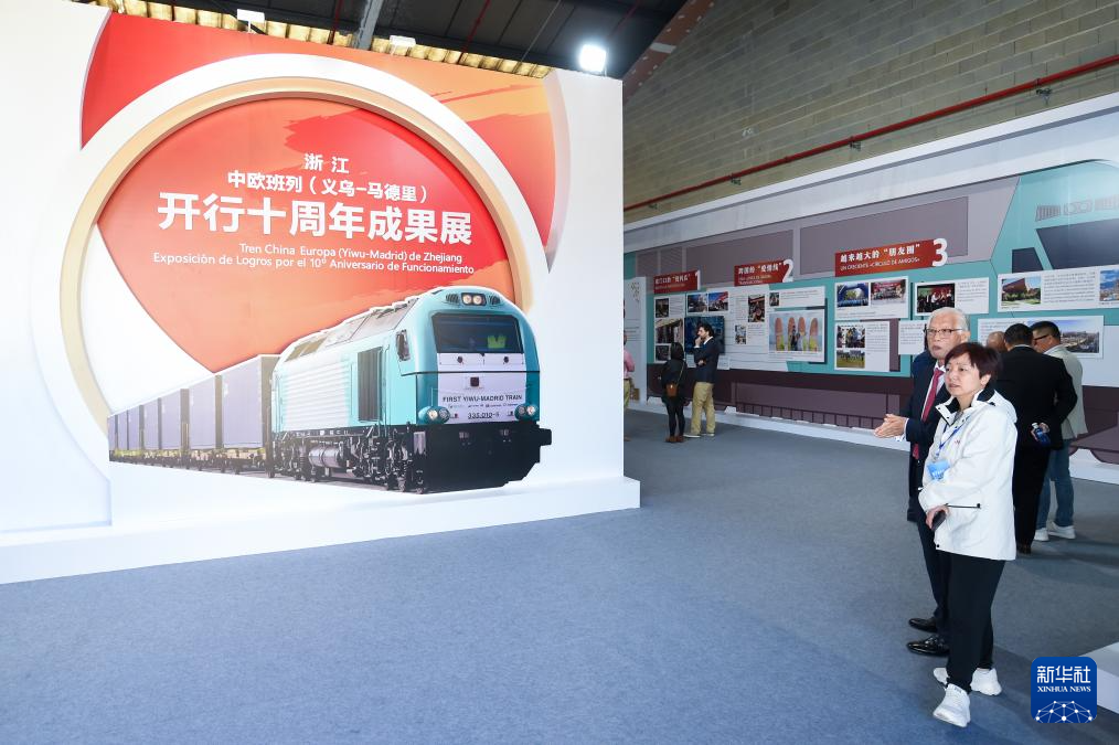 5月8日,在西班牙马德里,嘉宾参观中欧班列(义乌—马德里)开行十周年成果展。