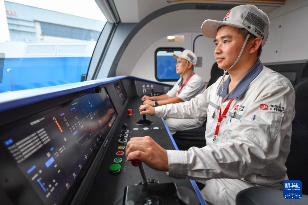 5月9日,工作人员在机车的智能座舱内查看视频监控、360环影的运行情况。