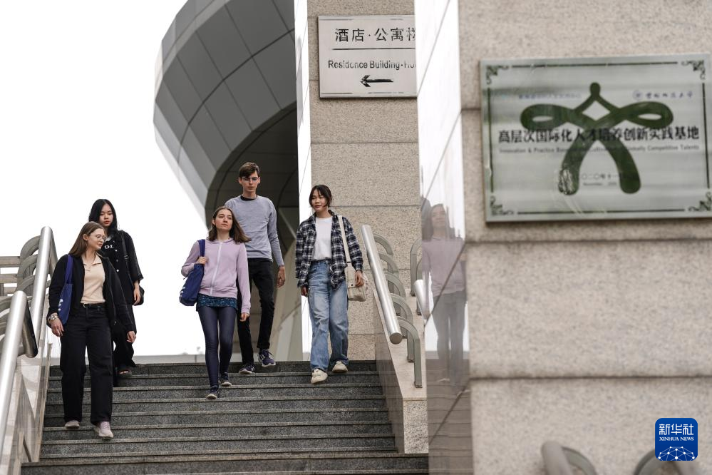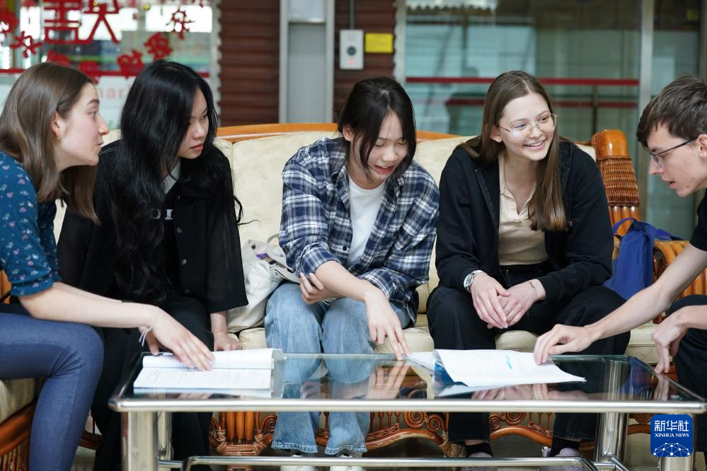 4月28日,宋智孝(右二)和胡灵月(左一)在北京首都师范大学校园内与同学交流。