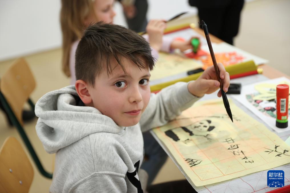 5月3日,在匈牙利布达佩斯,匈中双语学校三年级学生本杰明练习写毛笔字。