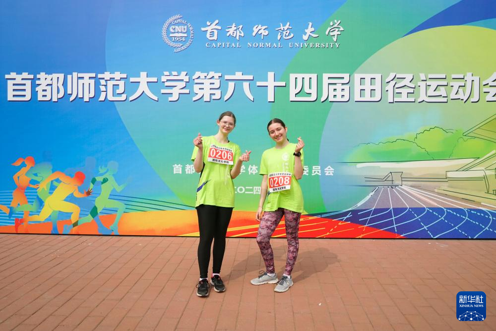 胡灵月(右)和宋智孝在北京首都师范大学参加运动会时合影(2024年4月摄)。